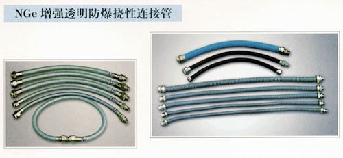 我廠生產(chǎn)的NGe增強透明防爆撓性連接管、防爆標志、ExeII防爆合格證號CE001140它除具有同類產(chǎn)品的性能之外,還具有外形美觀、耐用、可撓性好、結(jié)構(gòu)牢固可靠,軟管兩端為鋼制螺紋活接頭,兩端為壓口,表面鍍鋅或鍍鉻。軟管長度與接頭螺紋可根據(jù)用戶要求制作。